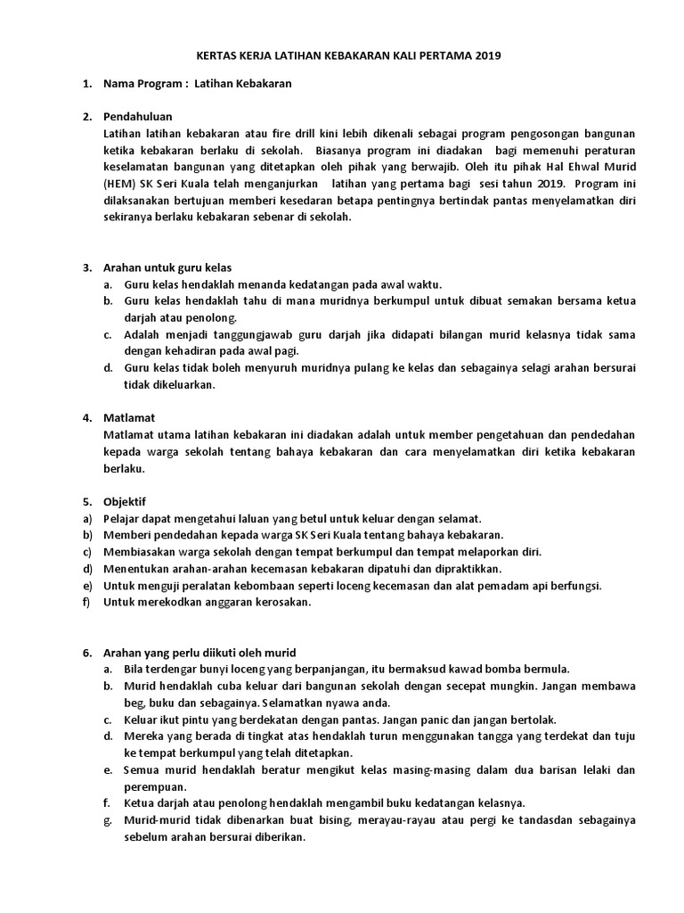 Latihan kebakaran atau latihan pengosongan bangunan. Panjang surat lamaran kerja yang lebih dari satu halaman sangat jarang, kecuali kamu melamar di bidang yang sangat teknis, misalnya: Kertas kerja program peningkatan akademik. Nama program latihan kebakaran (nama. Kertas kerja program bersepadu sekolah selamat (latihan kebakaran, menyelamat dan demonstrasi memadam kebakaran 2012).
